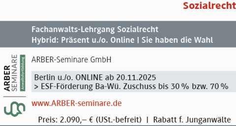 Veranstaltungsort(e): Berlin Veranstaltungsdatum: 20/11/2025Veranstalter: ARBER|Seminare GmbHRechts-/Fachgebiet: Arbeitsrecht und SozialrechtVeranstaltungsart: Fachanwaltslehrgänge, Seminare / Online-SeminareZur Webseite Drucken